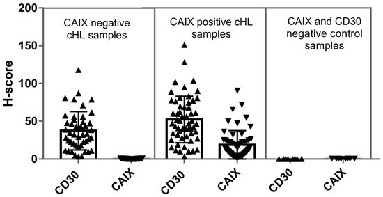CAIX immunopositivity proved to be highly variable, but CAIX H-score values (range: 2.16–90.4, mean 18.7 ± 18.8) appeared generally lower than CD30 H-scores (range: 3.46–151.33, mean 52.37 ± 30.74) suggesting the partial upregulation of the enzyme according to the functional diversity of HRS cell subpopulation (Figure 3).