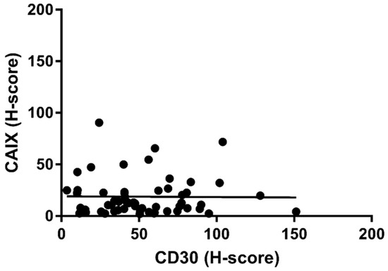 While the CD30+ burden was generally increased in the CAIX+ compared to the CAIX− samples, there was no further positive correlation between the amount of CD30+ mass and the extent of CAIX+ cells within individual CAIX+ cases (p-value = 0.475, Spearman rs: −0.008) (Figure 4).