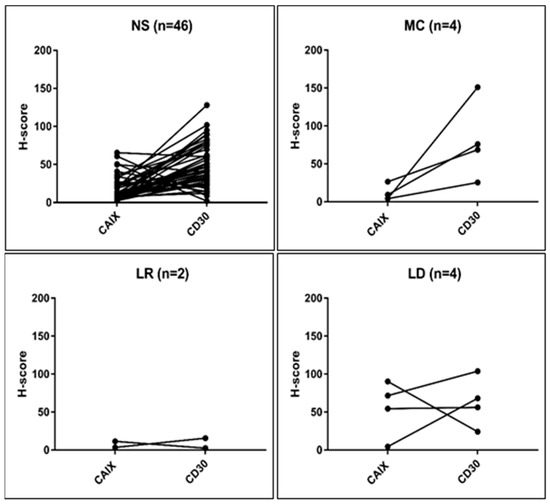 CAIX and CD30 H-scores measured in serial sections of CAIX-positive cHL (n = 56) according to the histological subtypes. CAIX H-score exceeded CD30 in six samples which was associated with low HRS-counts or low CD30 staining intensity.