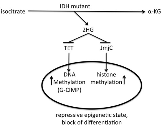 - Lu, C.; Ward, P.S.; Kapoor, G.S.; Rohle, D.; Turcan, S.; Abdel-Wahab, O.; Edwards, C.R.; Khanin, R.; Figueroa, M.E.; Melnick, A.; et al. IDH mutation impairs histone demethylation and results in a block to cell differentiation. Nature 2012, 483, 474–478. [Google Scholar] [CrossRef] [PubMed]
