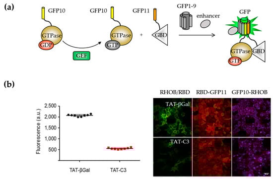 - Koraïchi, F.; Gence, R.; Bouchenot, C.; Grosjean, S.; Lajoie-Mazenc, I.; Favre, G.; Cabantous, S. High-content tripartite split-GFP cell-based assays to screen for modulators of small GTPase activation. J. Cell Sci. 2018, 131, jcs210419. [Google Scholar] [CrossRef] [PubMed]