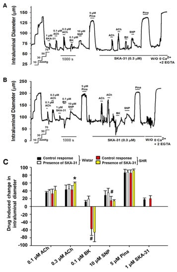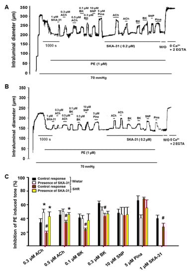 - Mishra, R.C.; Wulff, H.; Hill, M.A.; Braun, A.P. Inhibition of Myogenic Tone in Rat Cremaster and Cerebral Arteries by SKA-31, an Activator of Endothelial KCa2.3 and KCa3.1 Channels. J. Cardiovasc. Pharmacol. 2015, 66, 118–127. [Google Scholar] [CrossRef]