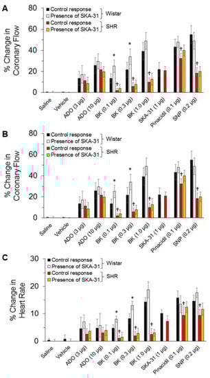 2.3. Regulation of Coronary Flow in Isolated Hearts from SHRs and Wistar Rats by Endothelium-Dependent and -Independent Vasodilators