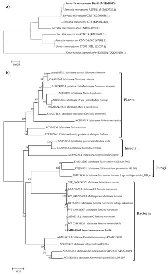 - Babashpour, S.; Aminzadeh, S.; Farrokhi, N.; Karkhane, A.; Haghbeen, K. Characterization of a chitinase (Chit62) from Serratia marcescens B4A and its efficacy as a bioshield against plant fungal pathogens. Biochem. Genet. 2012, 50, 722–735. [Google Scholar] [CrossRef] [PubMed]