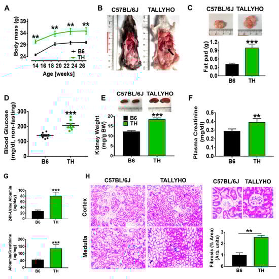 Analysis of these TALLYHO/JngJ and C57BL/6J (B6) mice showed that, at 14–27 weeks of age, TH mice had body masses (body weight, BWs) that were on average 15% greater than those of wild-type (WT) mice (Figure 1A). The increased BWs in the TH groups compared with B6 groups were also mirrored by the elevated adiposity. Figure 1B,C revealed increased visceral fat mass including retroperitoneal, perirenal and epididymal fat pads that were about twice as large as those in WT B6 mice at 23–27 weeks of age. Particularly, excess fat accumulation around the kidneys, known as fatty kidneys, is shown in Figure 1B. However, no significant differences were recorded between the high salt and normal chow groups. In contrast to WT B6 mice, TH mice exhibited mild but statistically significant elevations in non-fasting blood glucose (Figure 1D). The 49.4% increase in kidney size (kidney weight/body weight) observed in obese TH mice differed significantly from the values observed in B6 mice (Figure 1E). Moreover, there was a substantial increase in both plasma creatinine (Figure 1F) and 24 h urinary albumin excretion (Figure 1G) in obese TH mice when compared to the B6 mice. Semi-quantitative data on renal histology also showed an increase in glomerular and tubule-interstitial fibrosis in TH mice (Figure 1H). These findings indicate that the risk-factor clustering for cardiovascular disease associated with obesity and metabolic syndrome may play a role in impaired renal function exhibited by the obese TH mice.