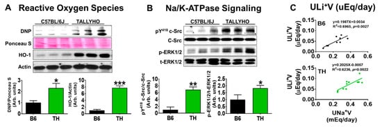 The regulation of blood pressure requires the maintenance of a balance between Na+ and water intake and Na+ and water excretion. We have reported that reactive oxygen species (ROS) can signal through the Na/K-ATPase signaling cascade including Src and ERK phosphorylation [,,], which is capable of regulating renal proximal tubule Na+ transport [,,,,]. Impairment of Na/K-ATPase signaling contributes to salt-sensitive hypertension in the experimental rat model []. Table 1 and Figure 2 illustrate Na/K-ATPase signaling is involved in regular salt and water balance, leading to stable body fluid volumes and the maintenance of normal blood pressure. As shown in Table 1, there was no significant difference in systolic blood pressure or total and fractional Na+ excretion rate between wild-type B6 and obese TH mice. Moreover, Na/K-ATPase signaling was activated as demonstrated by increased protein carbonylation and heme oxygenase-1 (widely used markers for enhanced ROS production, Figure 2A), and phosphorylation of c-Src and ERK1/2 (Figure 2B) in the kidney cortex tissues of TH mice, in comparison to WT B6 mice. More importantly, there were significant positive correlations between Na+ excretion and lithium (Li+) excretion rate over 24 h (Figure 2C), suggesting that the proximal tubule is engaged in Na+ handling in both of these strains.