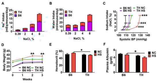 Salt-induced hypertension is initiated by increased blood volume. Total peripheral resistance (TPR) then becomes elevated, responsible for hypertension [,,,]. The volume of plasma and blood has been derived from indirect estimates of changes in the concentration of plasma proteins and the hematocrit [,,]. We next explored hemodynamic mechanisms initiating hypertension on a high salt diet in obese TH mice. After three weeks of a high salt diet, body weight in the TH groups on both high and regular salt diets was significantly higher than those in control groups (Figure 3D). High salt diets did not result in increased food consumption in TH mice on the respective diets versus their counterparts, reflecting that TH mice comsumed a similar amount of food as the B6 mice. Therefore, weight gain of about 4 g within 3 weeks of high salt diet (Figure 3D) in TH mice is not due to hyperphagia, suggesting fluid retention. At this moment, we believe that on normal chow, the TH mice are heavier than B6 mice due to the elevated adiposity (Figure 1B,C). While on a high salt diet, obese TH mice gained weight, which suggested fluid retention because there were no significant differences in fat-pad mass recorded between the high salt and normal chow groups. As compared to the WT B6 mice, the observed fall in hematocrit and plasma albumin in response to a high salt diet in TH mice (Figure 3E,F) indicated an increase in the plasma volume, in parallel with a significant increase in body weight (Figure 3D). Therefore, hypertension in obese TH mice on a high salt diet was caused by increased blood volume and water retention.