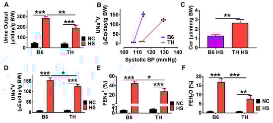 Research during the past four decades has demonstrated that obesity shifts the renal function curve to higher blood pressure due to the impaired renal Na+ excretion [,,,,]. The relationships between the excretion of Na+ and water and blood pressure in TH and B6 mice are presented in Figure 3C and Figure 4A–F. In normal chow groups, 24 h urine output and Na+ excretion rate were not significantly different, averaging 45.39 μL/day/g BW versus 42.67 μL/day/g BW in urine output (Figure 4A) and 9.261 μEq/day/g BW versus 10.64 μEq/day/g BW in urine Na+ excretion rate (Figure 4D) for B6 and TH mice respectively. Increasing SBP by 7 mmHg in the control B6 mice (from 107 to 114 mmHg, Figure 3C and Figure 4B) led to a 5.3-fold increase in urine output as well as comparable increases in total and fractional Na+ excretion (15.6-fold and 52.3-fold, respectively, Figure 4A,D,E).