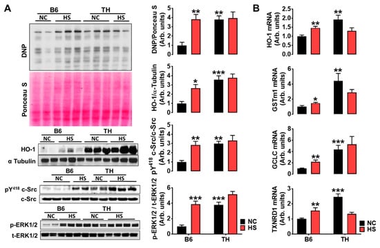 TH mice encounter dysregulation of Na/K-ATPase signaling. (A) In the kidney cortex tissues, reactive oxygen species (DNP: n = 5–10; HO-1: n = 9–12) and c-Src (n = 6–8) and ERK1/2 (n = 6–12) phosphorylation were activated, but not stimulated by HS diet in obese TH mice, in comparison to wild-type B6 mice. Left panel, representative Western blots. Right panel, quantitative analysis. (B) qRT-PCR analysis of nuclear factor erythroid 2-related factor 2 (Nrf2) target genes in the kidney cortex tissues. GSTm1, glutathione S-transferase M1. GCLC, glutamate-cysteine ligases. TXNRD1, thioredoxin reductase 1. * p < 0.05; ** p < 0.01; *** p < 0.001 versus B6 NC. HS, 7 days of 2% NaCl, 7 days of 4% NaCl, and then 7 days of 8% NaCl.