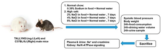 The protocol of the study was approved by the Marshall University Institutional Animal Care and Use Committee (IACUC#: 611. Approved on 25 April 2018), and all animal care followed the National Institutes of Health (NIH) Guide for the Care and Use of Laboratory Animals. Twenty week old male TALLHO/JngJ (TH) and C57BL/6J (B6) mice were obtained from the Jackson Laboratory (Bar Harbor, Maine, USA). All animals were housed in a pathogen-free facility under a controlled environment, consisting of a regulated light cycle (on 12 h, off 12 h), temperature (21–23 °C), and humidity (40–55%). The mice were divided into two groups as follows: (1) normal chow (NC); (2) high salt diet (HS, 7 days of 2% NaCl, 7 days of 4% NaCl, and 7 days of 8% NaCl). High salt diet pellets were purchased commercially from ENVIGO, Madison, WI, USA (2% NaCl, TD. 130345; 4% NaCl, TD. 110078; 8% NaCl, TD. 07501).