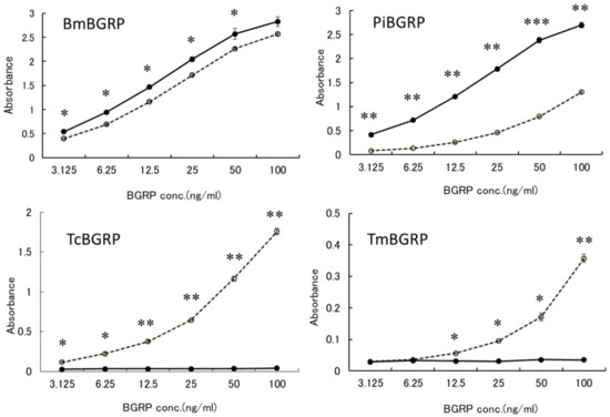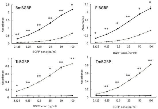 There was no difference in the biding ability of BmBGRP to SPG and AT-SPG. However, PiBGRP showed higher binding to SPG than AT-SPG. In contrast, Tribolium castaneum-derived BGRP (TcBGRP) and Tenebrio molita-derived BGRP (TmBGRP) showed no binding to SPG but bound to AT-SPG (Figure 1 lower).