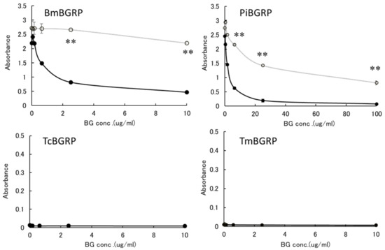 First, the effect of liquid phase of SPG and AT-SPG on BGRPs binding to SPG coated on ELISA plate was examined. As shown in Figure 3 and Figure 4, SPG or AT-SPG was immobilized on an ELISA plate. In the liquid phase, SPG and AT-SPG competitively inhibited the binding of BmBGRP and PiBGRP to solid phase SPG. In the case of BmBGRP and PiBGRP, binding to solid phase SPG was strongly inhibited by SPG (Figure 3 upper). The binding of BmBGRP to AT-SPG was not strongly inhibited by AT-SPG in the liquid phase, but strongly inhibited by SPG (Figure 4 upper). If it is assumed that BmBGRP binds to BG with a triple-helical conformation, the triplex portion remained in solid phase AT-SPG, and BmBGRP may bind to partially existing triple-helical conformation in the AT-SPG. It was suggested that SPG in the liquid phase acted as an inhibitor for the binding of BmBGRP and PiBGRP.