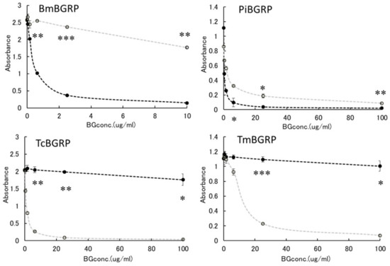 On the other hand, TcBGRP and TmBGRP did not bind to the solid phase SPG, and the competitive reaction could not be observed (Figure 3 lower). However, the binding properties on the AT-SPG coated plate were observed well. The absorbance decreased with increasing concentration of AT-SPG (Figure 4 lower). From these results, it was shown that BmBGRP and PiBGRP tend to bind to SPG, and TcBGRP and TmBGRP tend to bind to AT-SPG.