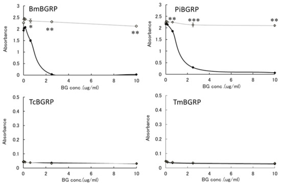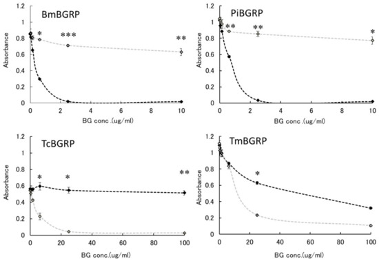 Binding activity of BGRP-Fc to laminarin and AT-laminarin in the liquid phase. Competition with liquid phase of laminarin (black diamond) and AT-laminarin (open diamond, gray line) in the BGRP-Fc binding to solid phase of laminarin (10 µg/mL). TcBGRP-Fc and TmBGRP-Fc failed to bind solid phase of laminarin (10 µg/mL). Absorbance of each sample was measured in duplicate in the experiment. Data shown are representative of two independent experiments with similar tendency. Statistical significance between native BG and AT-BG in liquid phase was shown as * p < 0.05, ** p < 0.01, *** p < 0.001.