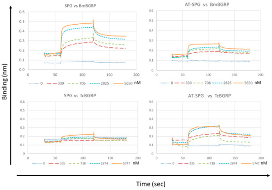 Binding affinity measurements of BmBGRP and TcBGRP to SPG or AT-SPG on BG-conjugated biosensors. KD, Ka, and Kd were measured and calculated by the BLitz system. All experiments were performed with at least two independent occasions in duplicate readings. The X-and Y-axis depicts the time in seconds and the binding in nm, respectively.