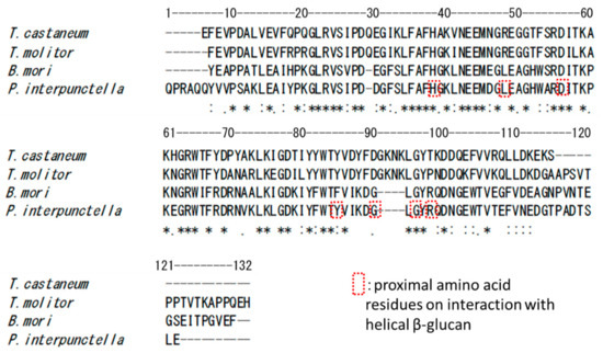 Sequence alignment of N-terminal domains of BGRP from Plodia interpunctella (P. interpunctella), Bombyx mori (B. mori), Tenebrio molitor (T. molitor), and Tribolium castaneum (T. castaneum). The amino acid residues surrounded by a dashed square are amino acid residues proximal to the helical β-glucan [13].