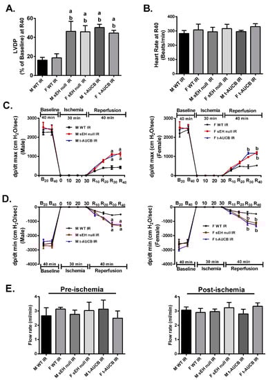 Although accumulating literature suggests that sEH enzyme is a good target to ameliorate IR injury [24,26,30], the differential response of both males and females to sEH inhibition has not been investigated. Notably, preischemic cardiac parameters were similar between males and females in all young treatment groups. sEH null hearts or WT hearts perfused with the sEH inhibitor trans-4-[4-(3-adamantan-1-yl-ureido)-cyclohexyloxy]-benzoic acid (t-AUCB) and subjected to IR showed significantly improved post-ischemic recovery of left ventricular developed pressure (LVDP) compared to the WT IR control group (Figure 1A). Importantly, both male and female hearts respond similarly to the genetic deletion of Ephx2 or pharmacological inhibition of sEH as there were no significant differences between both genders in terms of post-ischemic functional recovery (Figure 1A). Moreover, no significant differences were observed in the heart rate at the end of reperfusion between all the study groups (Figure 1B). Consistent with improved post-ischemic functional recovery, both male and female sEH null hearts or WT hearts perfused with t-AUCB demonstrated better rates of contraction (dP/dt max) and relaxation (dP/dt min) in comparison to the corresponding IR control mice (Figure 1C,D). Interestingly, the coronary flow rates did not significantly differ between pre- and post-ischemic perfused heart in any of the treatment groups in our model indicating the cardioprotective effect was not attributable to alterations in hemodynamics in the perfused heart model (Figure 1E). Together, these data suggest that the genetic deletion of Ephx2 or pharmacological inhibition of sEH similarly improve post-ischemic functional recovery in both males and females and as such data from both sexes were combined in the rest of the experiments.