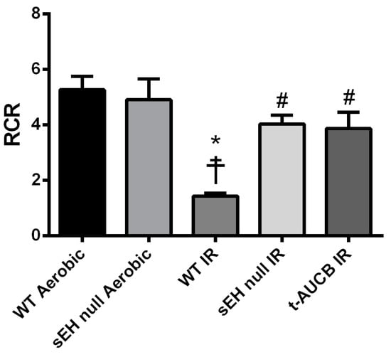 Mitochondria serve as the important arbiters of cardiomyocyte life and death [31]. Impaired mitochondrial function, associated with excessive ROS production, secondary to IR injury leads to a vicious cycle of continued injury and reduced cardiac contractile function [32,33]. Accordingly, we investigated the effect of the genetic deletion of Ephx2 or pharmacological inhibition (t-AUCB) of sEH on the mitochondrial respiration in fibers separated from hearts subjected to IR injury. Notably, basal respiration rates did not differ significantly between all groups (Table 1), however, respiratory control ratio (RCR), a marker of mitochondrial efficiency, was significantly reduced in post-ischemic WT vehicle control hearts compared to both the WT and sEH null aerobic controls (Figure 2). However, genetic deletion of Ephx2 or pharmacological inhibition of sEH preserved post-ischemic adenosine diphosphate (ADP)-stimulated respiration and RCR values, suggesting better mitochondrial function in post-ischemic hearts (Table 1).