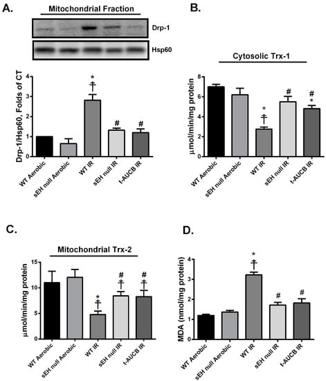 Deficiency of sEH preserved mitochondrial integrity and limited oxidative stress following ischemia/reperfusion (IR) injury. (A) Representative immunoblots and densiometric quantification of the expression of mitochondrial protein Drp-1 in mice hearts after 30 min ischemia and 40 min reperfusion. Protein expression was normalized to heat shock protein 60 (Hsp60) used as a loading control. Cardiac (B) cytosolic thioredoxin (Trx)-1 and (C) mitochondrial Trx-2 activities were assessed in hearts following 30 min ischemia and 40 min reperfusion. Trx activity was assessed using the insulin disulfide reduction assay. In this assay, by using an excess of NADPH and thioredoxin reductase (TrxR) enzyme, Trx activity was measured via the oxidation of NADPH and the generation of free SH groups in reduced insulin by 5,5’-dithiobis-(2-nitrobenzoic acid) (DTNB) after stopping the reaction with guanidine–HCl. (D) Cardiac MDA levels assessed using a lipid peroxidation (MDA) colorimetric assay kit in mice hearts following 30 min ischemia and 40 min reperfusion. Values represent mean ± SEM, * p < 0.05 vs. WT Aerobic CT, ☨ p < 0.05 vs. sEH null Aerobic, # p < 0.05 vs. WT IR (n = 3–5 per group).