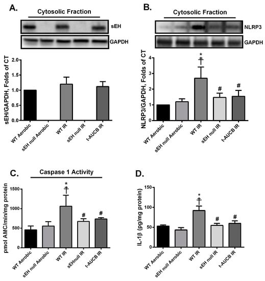 Immunoblotting confirmed the complete ablation of the gene encoding sEH (Ephx2) in sEH null animals (Figure 4A). Furthermore, there was no marked change in the expression of sEH protein in WT mice subjected to IR injury compared to their counterparts under aerobic conditions (Figure 4A). A direct correlation between mitochondrial dysfunction, excessive ROS production and the activation of NLRP3 inflammasome cascade has been well-established in several reports [8,43]. To determine the effect of the genetic deletion of Ephx2 or pharmacological inhibition of sEH on the activation of the NLRP3 inflammasome, we assessed the expression levels of NLRP3 and IL-1β proteins as well as caspase-1 activity. Immunoblot analyses showed that IR injury markedly up-regulated NLRP3 protein expression (Figure 4B), which correlated with increased catalytic activity of caspase-1 in WT hearts (Figure 4C). Moreover, enzyme-linked immunosorbent assay (ELISA) results revealed that active cytokine IL-1β was increased following IR injury in WT hearts (Figure 4D). Genetic ablation of Ephx2 or perfusing with t-AUCB markedly abrogated the IR-induced upregulation of NLRP3 and IL-1 β protein expression and prevented the increase of caspase-1 activity (Figure 4B–D). Altogether, these data suggest inhibition of sEH limits NLRP3 inflammasome activation correlated with reduced cardiac IR injury.