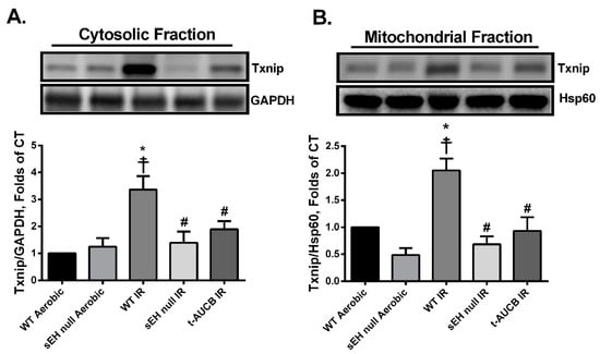 Thioredoxin-interacting protein (Txnip) is an upstream trigger in the NLRP3 inflammasome cascade that binds these two proteins together, which is essential for downstream activation. Furthermore, Txnip acts as a pro-oxidant protein by preferentially binding to and inhibiting the antioxidant activities of both Trx-1 and -2. Thus, Txnip serves as a central protein linking oxidative stress to NLRP3 inflammasome formation [44,45,46]. In the current study, post-ischemic WT hearts had a significant increase of both cytosolic and mitochondrial Txnip protein expression consistent with increased inflammasome formation and mitochondrial dysfunction (Figure 5A,B). Interestingly, the accumulation of Txnip correlates with the significant reduction in the antioxidant activities of both Trx-1 and -2 in WT hearts following IR injury (Figure 3B,C). In contrast, hearts perfused with t-AUCB or isolated from sEH null mice demonstrated significantly lower post-ischemic localization of Txnip in both cytosolic and mitochondrial fractions (Figure 5A,B).