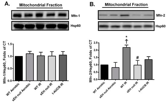 Emerging evidence for the non-canonical roles of Mfn-2 in the activation of different innate immune components and pathogenesis of IR injury indicates that mitochondrial dysfunction is associated with increased Mfn-2 expression, which accelerates cardiomyocyte death [113,114]. The exact mechanisms remain unknown, Mfn-2 mediated tethering of mitochondria and endoplasmic reticulum facilitate the transfer of calcium to the mitochondria. Under ischemic conditions, this phenomenon accumulates calcium in the mitochondria accelerating degradation [115,116]. Indeed, acute ablation of cardiac Mfn-2 reduces mitochondrial calcium overload, rendering the heart resistant to acute infarction following IR [117]. The current study demonstrated myocardial IR injury was associated with increased mitochondrial Mfn-2 protein expression but was prevented by inhibition of sEH. Altogether, we believe that deficiency of sEH limits the mitochondrial damage in response to injury; however, the connection between Mfn-2 and the protective mechanism(s) needs further investigation.