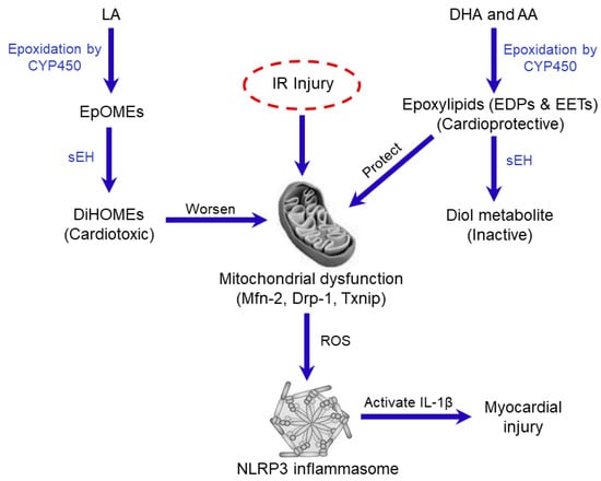 Schematic showing the potential roles of sEH in IR injury. Cellular injury in response to IR insult is associated with the release of polyunsaturated fatty acids (PUFAs) from the cell membrane which can be metabolized via epoxidation by cytochrome P450 (CYP450) isoenzymes to linoleic acid (LA) metabolites epoxyoctadecenoic acids (EpOMEs), which are further metabolized by sEH to dihydroxyoctadecenoic acid (DiHOMEs) with cardiotoxic effects targeting mitochondria resulting in injury. In contrast, sEH rapidly degrades the cardioprotective epoxylipids, epoxydocosapentaenoic acids (EDPs) and epoxyeicosatrienoic acids (EETs), generated from the CYP-mediated metabolism of the n-3 docosahexaenoic acid (DHA) and n-6 arachidonic acid (AA), respectively. These biologically active epoxy metabolites mediate many of the beneficial cardiovascular effects of the parent PUFAs by maintaining mitochondrial quality and reducing adverse inflammatory reactions. IR injury triggers the translocation of dynamin-related protein-1 (Drp-1) from the cytosol to the mitochondria initiating events that lead to the assembly and oligomerization of NLPR3 inflammasome. Active NLPR3 shuttles Txnip to the mitochondria aggravating mitochondrial damage as well the formation of the pro-inflammatory cytokine IL-1β triggering cardiomyocyte cell death.