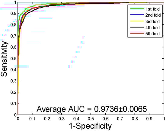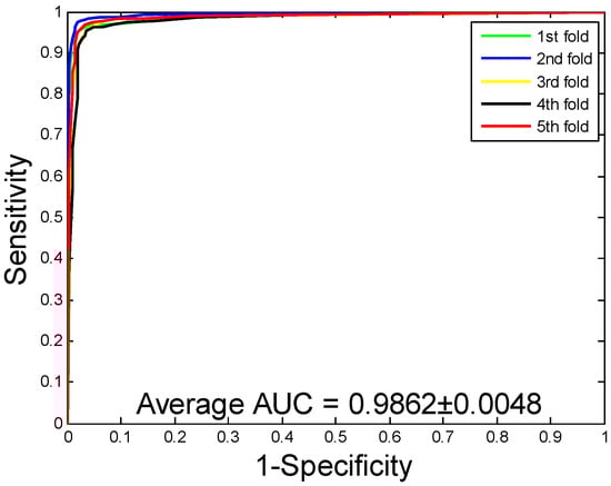 When our method is used to predict the PPIs of the Yeast dataset, the average accuracy, precision, sensitivity, and MCC of the prediction results are well displayed, which are 92.12%, 94.20%, 89.76%, and 85.46%, respectively. The standard deviations of these predicted results are 0.54%, 0.78%, 0.96%, and 0.92%, respectively. When our method is adopted to predict the PPIs of the Human dataset, our method also obtains good prediction results of average accuracy, precision, sensitivity, and MCC, which are 96.21%, 97.23%, 94.77%, and 92.70%, respectively. The standard deviations of these predicted results are 0.76%, 1.19%, 1.09%, and 1.42%, respectively. When our method was utilized to predict the PPIs of the H. pylori dataset, the average accuracy, precision, sensitivity, and MCC were predicted to be 86.59%, 87.70%, 85.17%, and 76.73%, respectively. The standard deviations of these predicted results are 0.48%, 1.89%, 2.20%, and 0.74%, respectively. The ROC curves of the proposed model on three datasets are Figure 2, Figure 3 and Figure 4. Here, the X-axis indicates the false positive rate, while the Y-axis denotes the true positive rate. In order to better verify the feasibility of our method, AUC values are calculated on Yeast, Human, and H. pylori datasets and their average AUC values are 96.11%, 98.62%, and 92.69%, respectively.