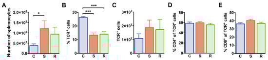 2.3. Reduced Percentages of T Lymphocytes in Susceptible and Resilient Mice after Social Defeat Stress