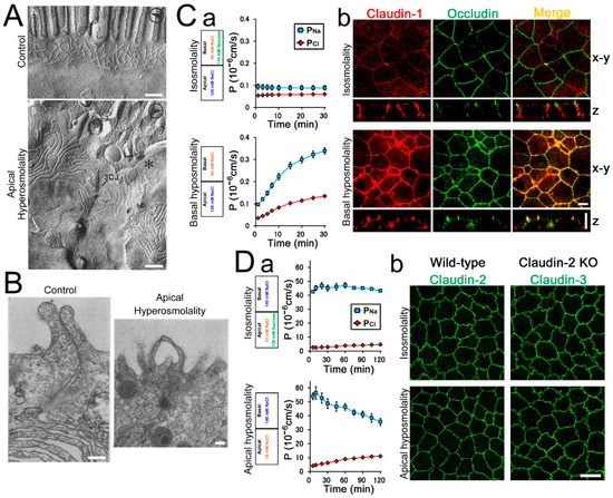 Effects of the osmotic gradient in various epithelia. (A) Freeze-fracture electron micrographs in the jejunal epithelium. Apical osmolality was increased to 600 mOsm with mannitol and cells were fixed 20 min after the osmotic changes. Apical hyperosmolality increased tight junction (TJ) strand number and depth. Scale bar = 200 nm. From Madara. J. Cell Biol. 1983 [11] with permission. (B) Transmission electron micrographs in the bladder epithelium. Apical osmolality was increased with 240 mM urea and cells were fixed 10 min after the osmotic changes. Apical hyperosmolality induced bleb formation between TJ strands. Scale bar = 200 nm. From Wade et al., Am. J. Physiol. 1973 [15] with permission. (C) Effects of basal hypoosmolality on Xenopus A6 cells. (a) Basal osmolality was decreased by the reduction of NaCl concentration or counterbalanced by the addition of sucrose, and permeability of sodium and chloride (PNa and PCl) were calculated from transepithelial resistance and dilution potentials in the presence of Na+, K+ and Cl– channel blockers. Basal hypoosmolality increased PNa and PCl with the selective increase of PNa. (b) Immunofluorescence of claudin-1 and occludin. Cells were fixed 30 min after the osmotic changes. Basal hypoosmolality altered claudin-1 localization to the apical end and claudin-1 showed colocalization with occludin. Scale bar = 5 µm. Modified from Tokuda et al., Biochem. Biophys. Res. Commun. 2008 [16] and Tokuda et al., Biochem. Biophys. Res. Commun. 2010 [17] with permission. (D) Effects of apical hypoosmolality on Madin–Darby canine kidney (MDCK) II cells. (a) Apical osmolality was decreased by the reduction of NaCl concentration or counterbalanced by the addition of sucrose. Apical hypoosmolality induced the reduction of cation selectivity. (b) Immunofluorescence of claudin-2 or claudin-3 in wild-type and claudin-2 knockout cells. Cells were fixed 30 min after the osmotic changes. Apical hypoosmolality altered the shape of cell–cell contact from zigzag to more straight shape in wild-type cells but not in claudin-2 knockout cells. Scale bar = 10 µm. Modified from Tokuda et al., PLoS ONE. 2016 [18] with permission.