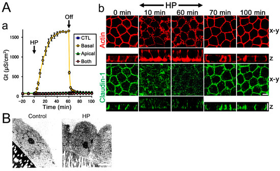 In mammary glands, HP in the apical side fluctuates with milk production and breastfeeding and the permeability of TJs in mammary epithelia is known to be affected by the status of milk storage in vivo. The HP gradient has been reported to affect transepithelial transport in cultured mammary epithelial HC11 cells [57,58]. The HP from basal side decreases TER and changes the direction of Isc. The increase of HP in both sides has no effect on TER. Thus, the HP gradient from a basal side affects TER and transcellular transport, which may be involved in the regulation of transepithelial transport in milk production and breastfeeding.