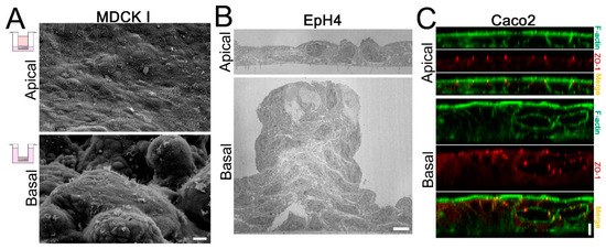 Effects of the HP gradient on carcinogenic properties of epithelia. (A) Scanning electron micrographs in MDCK I cells. 0.6 cmH2O HP was applied from apical or basal side for four days. A bumpy surface with cell masses was observed when the HP was applied from a basal side. Scale bar = 10 µm. (B) Transmission electron micrographs in EpH4 cells. 0.6 cmH2O HP was applied from apical or basal side for four days. HP from a basal side induced stratification. Cavities were observed within the stratification. Scale bar = 5 µm. (C) Immunofluorescence of F-actin and ZO-1 in Caco2 cells. 0.6 cmH2O HP was applied from apical or basal side for eight days. HP from a basal side induced stratification. ZO-1 was localized at the cavities within the stratification. Scale bar = 5 µm. Modified from Tokuda et al., PLoS ONE. 2015 [113] with permission.