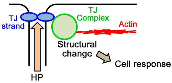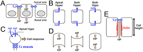 In contrast, it is simple to consider the possibility that TJs act as a sensor of the HP gradient. The push of TJ strands to apical or basal side and movement of water through the TJs is sensed by the TJs. One of the possible mechanisms in this case is that the pressure to the TJ strands changes the structure of the intracellular proteins in TJ complexes and the tension applied to the cytoskeleton (Figure 5). The structural changes of F-actin in the lateral side and the increase of cell height by the HP gradient from basal side in Xenupus A6 cells may reflect the effect of HP gradient on the tension in F-actin (Figure 2A and Figure 4E, [51]).