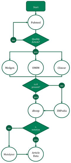 Articles meeting these criteria were next cross-referenced with MedGen, Online Mendelian Inheritance of Man (OMIM), and ClinVar. If the variant did not have a dbSNP identifier, one was obtained from SNPedia. If C. notation for the variant was not available, the information was obtained with Mutalyzer. The PubMed identifier was also recorded.