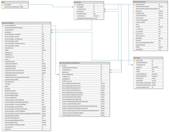 Nutrigenetics variant data annotated from the literature, NCBI databases, and the USDA nutrient data was modeled in a MySQL database. The database has six tables (Figure 4). These include a user table (“User”) (with an anonymized user ID), a table linking each user to the relevant nutrigenetic variant entries (“UserEntry”), the genetic variant table (“NutrigeneticsEntry”), a genotype table (“Genotype”), a dietary suggestion table, and a table with foods and nutrients relevant to the entries on the suggestion table (“FoodOrNutrient”). The “NutrigeneticsEntry” table contains general information about the database variants with gene summaries, the dbSNP ID, phenotype, and chromosomal position. Each entry in the “NutrigeneticsEntry” table corresponds to one or more entries in the “Genotype” table. These entries include information on the effected minor frequency SNPs, including SNPs and p-values, odds ratios, and confidence intervals for the variant-disease interaction.