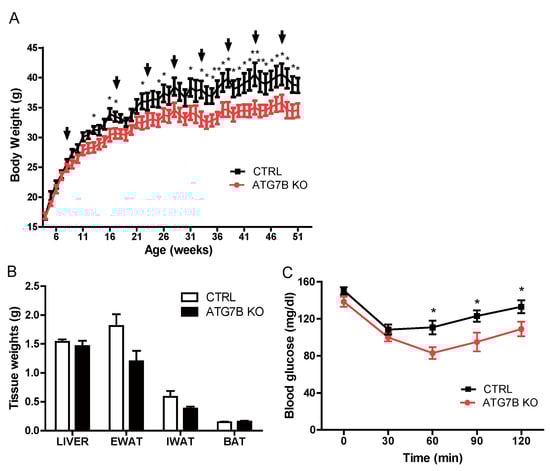 2.2. Suppression of BAT Autophagy Reduces Body Weight and Improves Glucose Metabolism