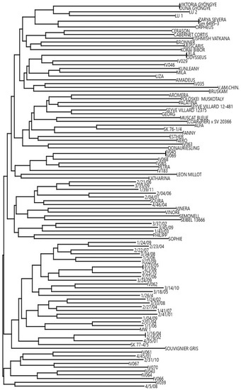 - This, P.; Jung, A.; Boccacci, P.; Borrego, J.; Botta, R.; Costantini, L.; Crespan, M.; Dangl, G.S.; Eisenheld, C.; Ferreira-Monteiro, F.; et al. Development of a standard set of microsatellite reference alleles for identification of grape cultivars. Theor. Appl. Genet. 2004, 109, 1448–1458. [Google Scholar] [CrossRef]