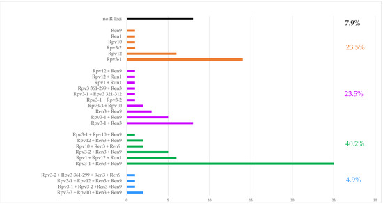 Grouped bar chart showing the percentual of accessions with single resistance locus, combination of two, three and four resistance (R) loci and absence of any studied R-locus. Rpv: Resistance to Plasmopara viticola; Run: Resistance to Uncinula necator (from Muscadinia spp.); Ren: Resistance to Erysiphe necator (from Vitis spp.).