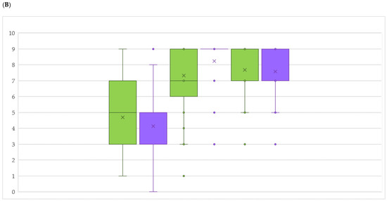 Box plots comparing OIV scores of resistance level in years 2016, 2017 and 2018 for downy (A) and powdery (B) mildew on leaves (green) and bunches (violet). Per each year, the lowest score between evaluations was chosen.