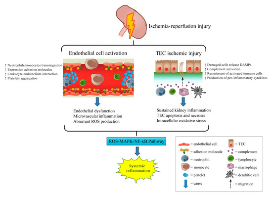 In the early stages of renal ischemia, the circulating neutrophils and monocytes rapidly infiltrate the ischemic kidney and release lysosomal enzymes, leading to tubular epithelial cell injury [2]. Subsequent crosstalk between the injured TECs, activated endothelial cells, and tissue macrophages induces oxidative stress and complement activation, aggravating cell damaging processes, such as mitochondrial dysfunction and lipid peroxidation [5].