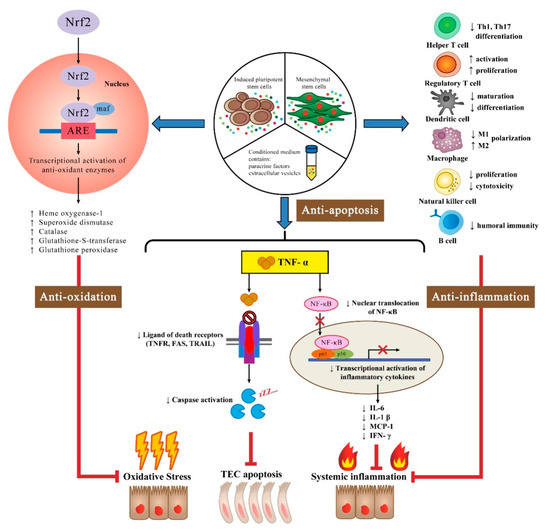In contrast to previous therapeutic approaches for AKI, which were mainly supportive, innovative treatments targeting AKI-induced inflammation, including stem cell therapy, have elicited a great deal of interest. In experimental models, administration of stem cells has proven effective in the treatment of AKI. One of the critical mechanisms of stem cell therapy is the anti-inflammatory effect caused by interaction with immune cells in the inflamed microenvironment [8,9,10]. Furthermore, stem cells may minimize the magnitude of tissue damage by secreting soluble cytoprotective factors in a paracrine manner [11,12].