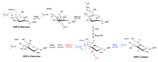 Indeed, it was found that the reaction catalyzed by GM35E starts with an oxidation at C4 of GDP-mannose with the aid of an NAD-cofactor that is tightly bound to the enzyme and a conserved tyrosine residue that acts as catalytic acid to assist the deprotonation, hereby highlighting GM35E’s similarity to other enzymes in the carbohydrate epimerase family 1 (CEP1) [25], such as UDP-glucose 4-epimerases (Gal4E) [26,27]. This oxidation results in a transient keto-intermediate at C4, which merely functions to lower the pKa of the protons on the neighboring carbons. Subsequently, a cysteine and lysine act as catalytic acid and base, respectively, and they accomplish the sequential de- and reprotonation at C5 and C3. Eventually, both the C3,5-4-keto- and C5-4-keto-epimer can be reduced back, resulting in GDP-l-galactose and GDP-l-gulose as by-product [12], as shown in Figure 1. On that account, GM35E is an exceptional epimerase as it is able to perform three distinct catalytic reactions (oxidation, epimerization, and reduction) in the same active site. This is in contrast to other nucleotide sugar pathways that require multiple enzymes for an equivalent series of reactions. Indeed, GDP-4-keto-6-deoxy-d-mannose-3,5-epimerase-4-reductase, for example, only performs epimerization and reduction. Consequently, that enzyme is dependent on a preceding oxidation by a 4,6-dehydratase [28]. Another example is the production of l-rhamnose from d-glucose, which requires consecutive oxidation at C4 and C6, epimerization at C3 and C5, and final reduction at C4. In bacteria, the latter reaction requires three separate enzymes [29]. However, it was discovered that Arabidopsis thaliana combines the epimerase and reductase activity within one bifunctional enzyme [30]. These findings, together with the realization that no bacterial GM35Es are characterized to date, could imply that some bacteria distribute the 3,5-epimerization of GDP-Man over several enzymes.