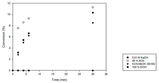 Evaluation of enzyme inactivation methods. Reaction mixtures (2 mM GDP-Man, 0.01 mg/mL MfGM35E, pH 8) were incubated at 37 °C. At defined time points, samples were 10× diluted in various inactivation solutions (0.01 M NaOH, 45% acetonitrile (ACN), acetonitrile/methanol (MeOH) (50:50), or 100% ethanol (EtOH)). The y-axis represents the conversion of GDP-Man towards GDP-L-Gal.