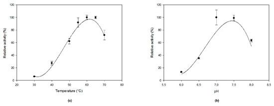 The effect of (a) temperature and (b) pH on MfGM35E activity. The pH and temperature profiles were determined in the presence of 2 mM GDP-Man at 40 °C and pH 8, respectively.