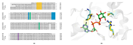 MfGM35E is part of the short-chain dehydrogenase/reductase (SDR) superfamily, of which the members display conserved features such as a GxxGxxG motif for NAD(P)+ binding within an N-terminal Rossmann fold and a YxxxK catalytic motif at their C-terminus [40]. This was confirmed by a multiple sequence alignment of MfGM35E and the four reviewed plant GM35Es, all sharing about 50% sequence identity with the bacterial epimerase, as shown in Figure 4a. In addition, the upstream serine as part of the catalytic triad and the catalytic cysteine and lysine, responsible for oxidation/reduction at C5 and C3 in GM35E, are highlighted. For plants, it was found that some species have an altered NAD-binding motif (GxxGxxA), which is the case for AtGM35E for instance, as shown in Figure 4a [22,23]. Interestingly, the GM35E sequence of Candidatus Sulfotelmatobacter kueseliae (UniProt: A0A2U3KM14) also contains this modified GxxGxxA motif, as shown in Figure 5. The GxxGxxG motif in members of the SDR superfamily is known to tightly bind an NAD(P)+ molecule, obviating the need for additional NAD(P)+. However, it was found for AtGM35E and OsGM35E that the addition of NAD+ resulted in an increased activity, regardless of the conservation of the GxxGxxG motif [22,23]. For MfGM35E as well, a 65% increase in activity was observed, independent of the added concentration of NAD+, as shown in Figure 6. These findings are surprising in view of the observations with other members of the SDR superfamily and the fact that AtGM35E’s crystal structure contains a bound NAD+ molecule [12]. On the contrary, supplementation with NADH had no significant impact, as shown in Figure 6.