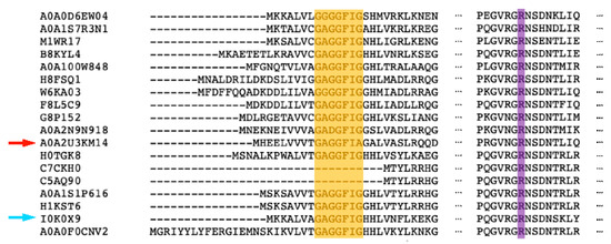 Multiple sequence alignment of the 18 putative bacterial GM35Es found in UniProt. The GxxGxxG motif is highlighted in yellow, whereas the conserved arginine (R) is colored in purple. The variants are represented by their UniProt code. The bacterial GM35E displaying the alternative GxxGxxA motif is marked by a red arrow, and MfGM35E is indicated by a blue arrow.