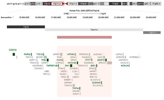 - Stratton, R.F.; Dobyns, W.B.; Greenberg, F.; DeSana, J.B.; Moore, C.; Fidone, G.; Runge, G.H.; Feldman, P.; Sekhon, G.S.; Pauli, R.M. Interstitial deletion of (17) (p11.2p11.2): Report of six additional patients with a new chromosome deletion syndrome. Am. J. Med. Genet. 1986, 24, 421–432. [Google Scholar] [CrossRef]