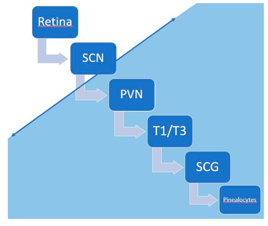 - Kappers, J.A. The development, topographical relations and innervation of the epiphysis cerebri in the albino rat. Zeitschrift für Zellforschung und mikroskopische Anatomie 1960, 52, 163–215. [Google Scholar] [CrossRef]