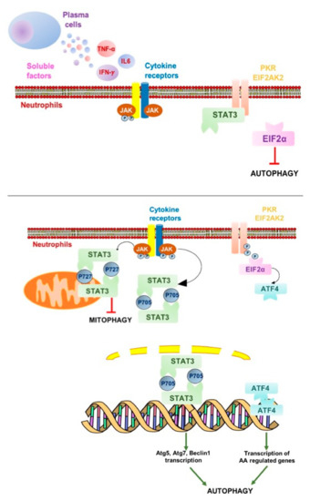 - Shen, S.; Niso-Santano, M.; Adjemian, S.; Takehara, T.; Malik, S.A.; Minoux, H.; Souquere, S.; Marino, G.; Lachkar, S.; Senovilla, L.; et al. Cytoplasmic STAT3 represses autophagy by inhibiting PKR activity. Mol. Cell 2012, 48, 667–680. [Google Scholar] [CrossRef]
