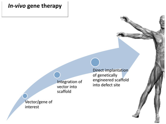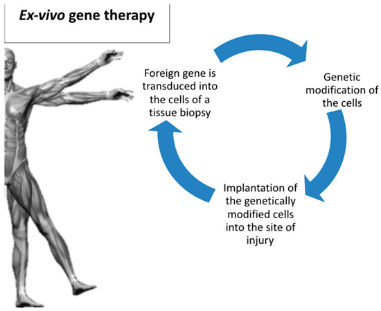 While in ex vivo gene transfer, the foreign gene is transduced into the cells of a tissue biopsy, followed by genetic modification of these cells under in vitro conditions (Figure 2). After this preparation phase outside the body, these cells are subsequently implanted into the site of injury [21,29].